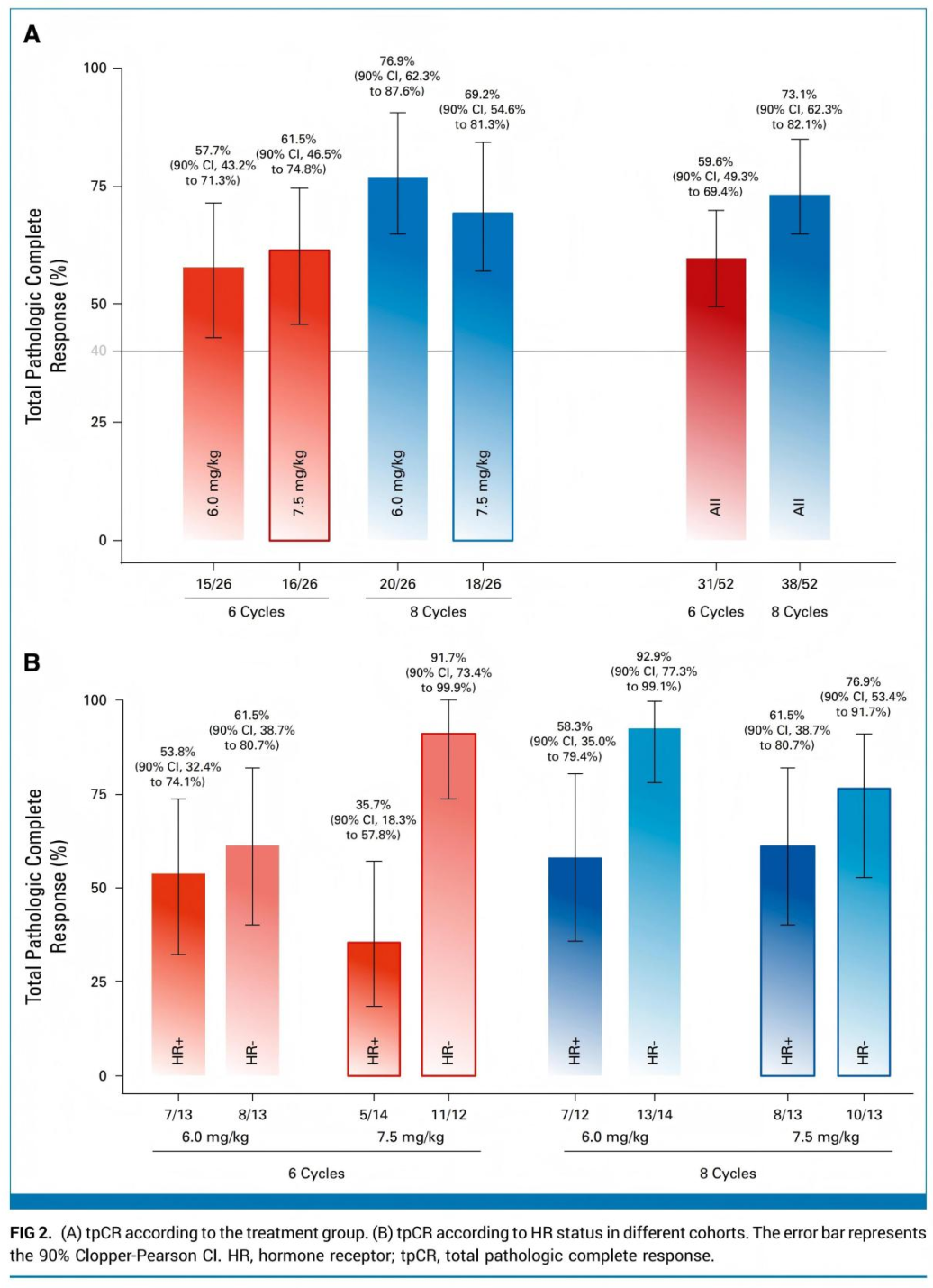 该研究共纳入104例初治II?III期HER2阳性乳腺癌患者,设置四个队列进行相关探索,队列1是6.0 mg/kg、6周期,队列2是6.0 mg/kg、8周期,队列3是7.5 mg/kg、6周期,队列4是7.5 mg/kg、8周期,取得了非常好的结果。
