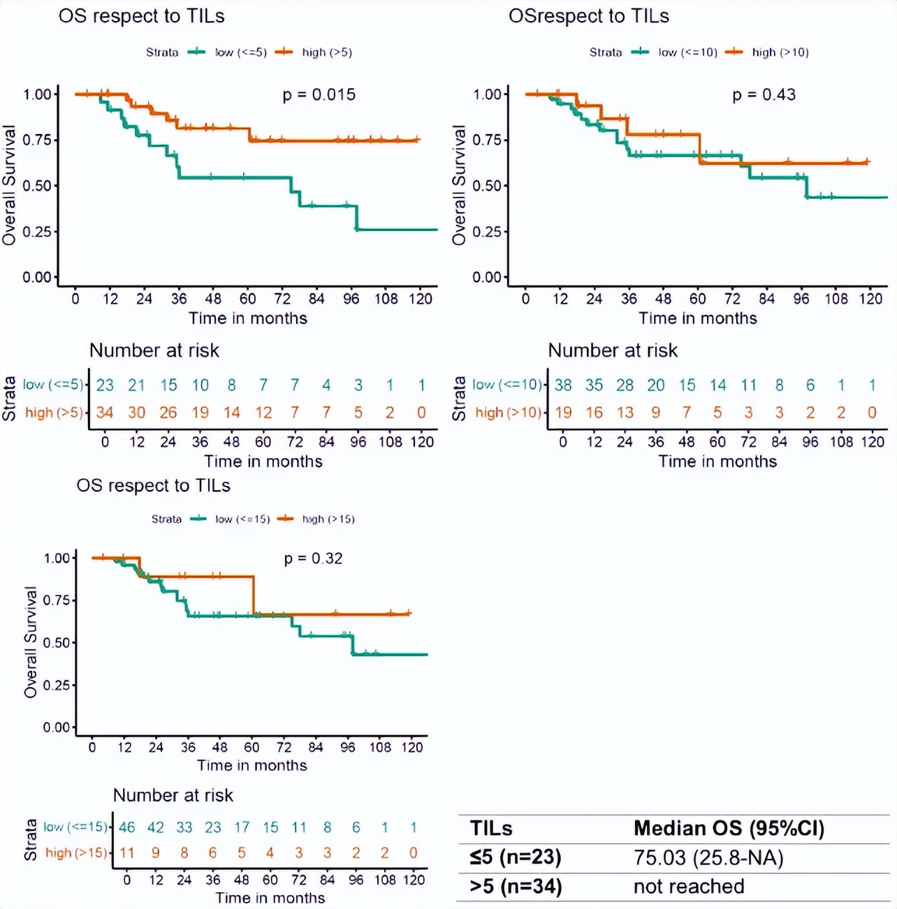 此外,TIL水平>5%的患者的中位OS显著长于TIL水平≤5%的患者。单变量分析显示,低TIL水平(≤5%)与OS较差相关(HR=3.18,P=0.021)。调整临床变量后,TIL与OS的关联处于统计学显著性极限值(HR=2.97,P=0.075),但在后续模型中,显著关联得到证实(HR=3.17,P=0.024)。作为连续变量(每增加10%),较高的TIL水平与更好的OS显著相关(HR=0.45,P=0.048)。在控制临床变量时,也观察到了类似的趋势,但未达到统计学意义(HR=0.44,P=0.104)。