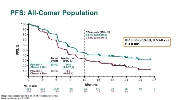 帕博利珠单抗联合组对比安慰剂组显著延长了无进展生存期,中位PFS分别为10.4个月vs 8.2 个月(HR=0.65;95% CI: 0.53-0.79;p<0.001)。
