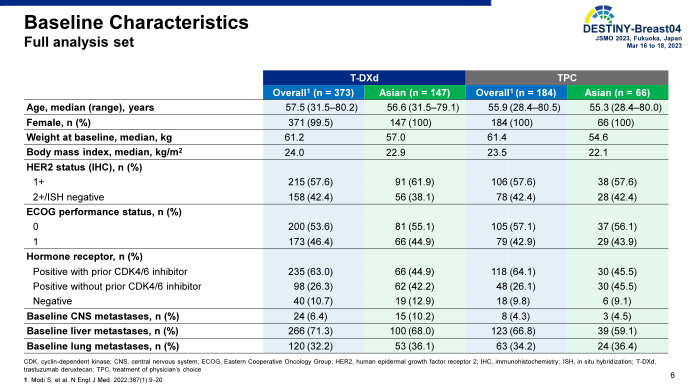 共入组557例患者,其中213例(38.2%)来自亚洲国家/地区(日本为85例,中国为62例,韩国为57例,中国台湾为9例)。亚洲人群中,两组患者的基线特征相似;TPC组患者的治疗方案分别为艾日布林(56.1%)、卡培他滨(18.2%)、白蛋白紫杉醇(10.6%)、吉西他滨(10.6%)或紫杉醇(4.5%)。停止T-DXd治疗的主要原因是疾病进展(58.5%)、不良事件(17.7%)和受试者退出(5.4%);停用TPC的主要原因是疾病进展(85.7%)、不良事件(6.3%)和受试者退出(4.8%)。