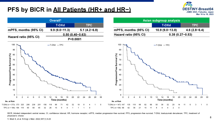 在HR+患者中,亚洲亚组的T-DXd组中位PFS相较于TPC治疗延长了5.6个月(10.9 vs 5.3个月),与整体获益一致(10.1 vs 5.4个月)。亚洲亚组的疾病进展或死亡风险显著降低59%(HR 0.41,95%CI:0.28~0.58)。