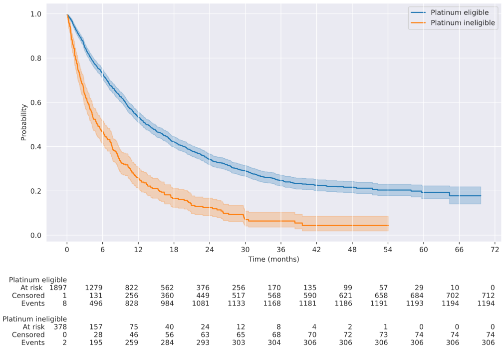 在铂类耐受患者中,少数(36%,n=677)接受了PD-1/PD-L1抑制剂;大多数接受了铂类化疗(64%,n=1229):其中多于半数(58%,n=709)接受了顺铂类方案,而42%(n=520)接受了卡铂类方案。